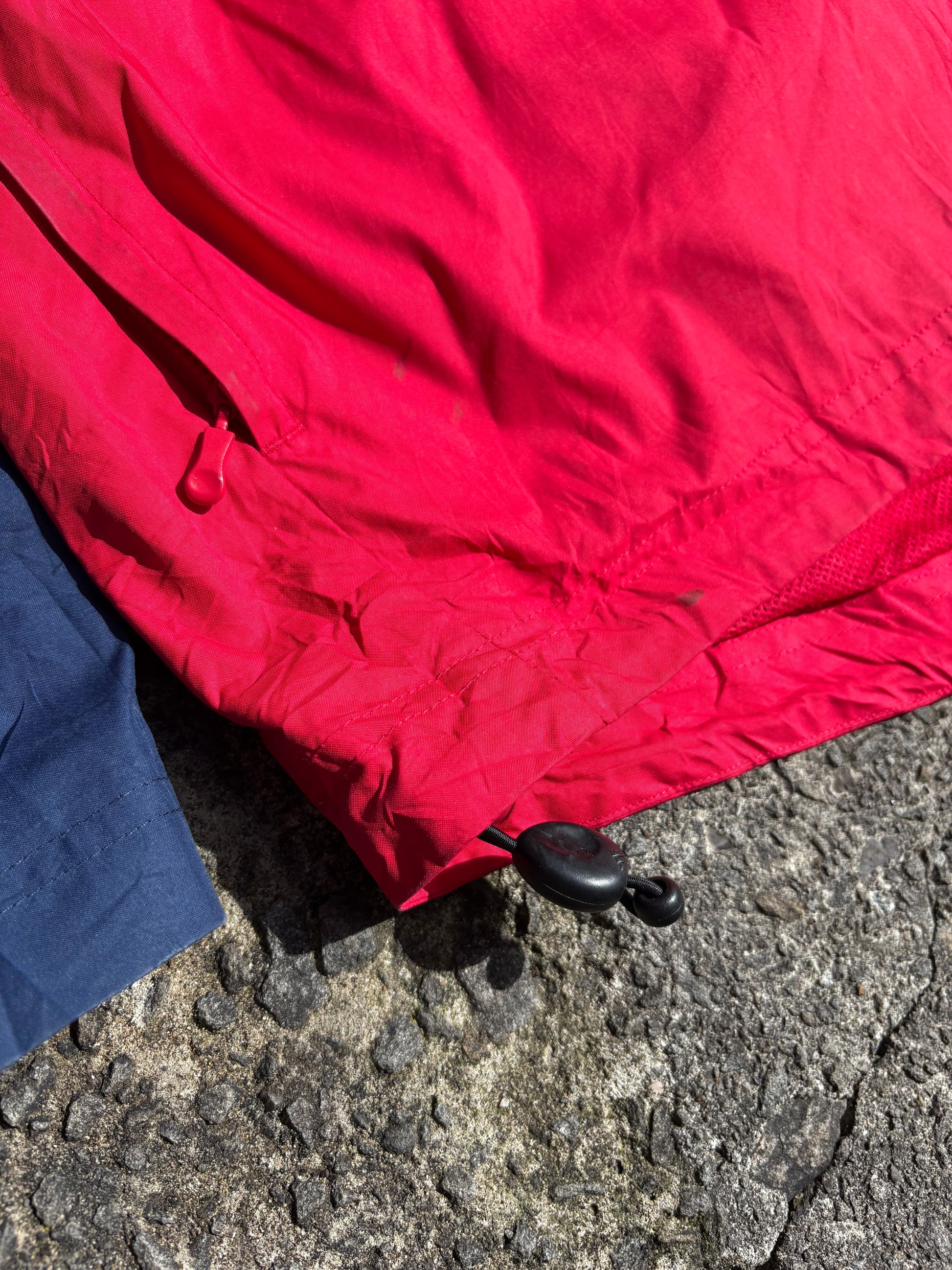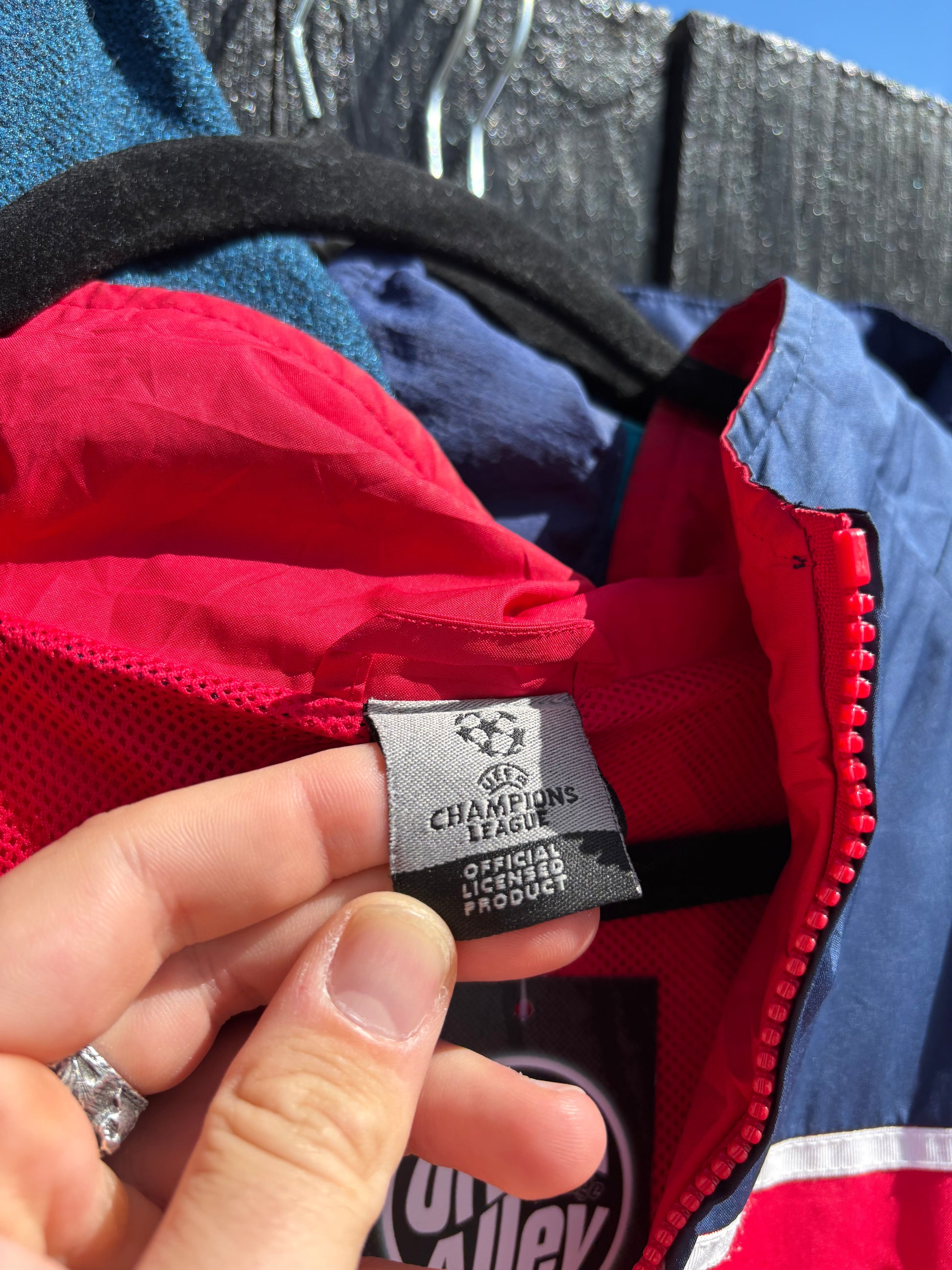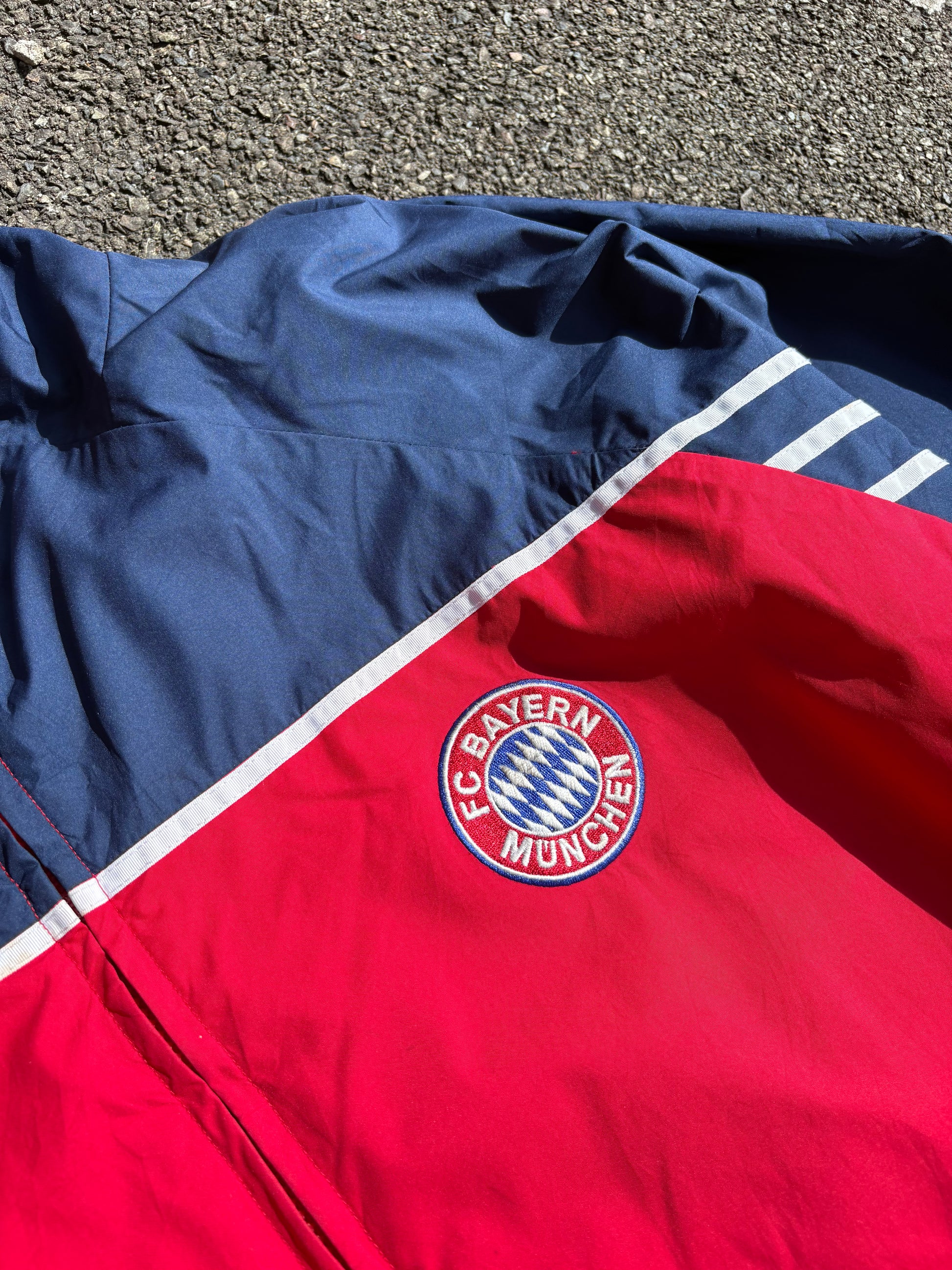 Introducing the Adidas Bayern Munchen Champions League Jacket. Made from 100% durable polyester, this red jacket features navy panelled sleeves for a unique look. The front and inside tags boast the exclusive Champions League sponsorship, making this a one-of-a-kind piece. Embroidered adidas logos and the iconic 3 stripes complete the design, along with two convenient zip pockets.